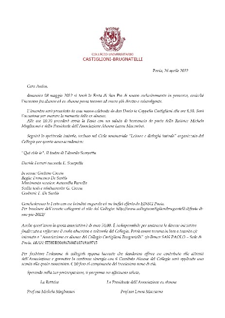 Qualche estratto dalla Lettera di San Pio 2022:"Cara Amica, domenica 8 maggio 2022 si terrà la Festa di San Pio di nuovo sclusivamente in presenza, cosicché l'incontro tra alunne ed ex-alunne possa tornare ad essere più diretto e coinvolgente. L'incontro sarà preceduto da una messa celebrata da Don Dario in Cappella Castiglioni alle ore 9.30. Sarà l'occasione per onorare la memoria delle ex alunne. Alle 10.30 prenderà avvio la Festa con un saluto di benvenuto da parte della Rettrice Michela Magliacani e dalla Presidentessa dell'Associazione Alunne Laura Maccarini. [...] Anche quest'anno la quota associativa è di 50,00 euro. è indispensabile per sostenere le diverse inizative finalizzate a rafforzare il ruolo educativo e culturale del Collegio. Potrà essere versata in loco o trmite c/c intestato a "Associazione ex alunne del Collegio Catsiglioni Brugnatelli" c/o Banca SAN PAOLO - sede di Pavia. IBAN: IT58H0306967684510749169715
